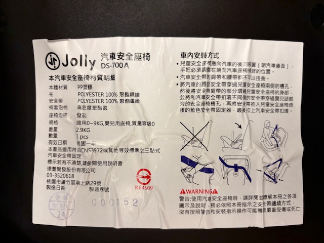 材質:本體-PP塑膠、布/安全帶-聚脂纖維、椅套泡棉-高密度聚酯氨、座椅泡棉-發泡